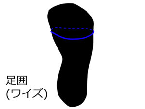 ちなみに足幅と足囲を混同してしまう人がいますが、足囲(ワイズ)は親指の付け根と小指の付け根を結ぶ足一周の長さのことで、スニーカーでいうところのE、2E,3Eという表記で表す部分です。