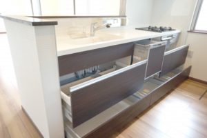 ちなみに、調理台下にはお鍋やフライパン、ワークスペース下には、台所洗剤の買い置きなどを収納してもいいと思います。