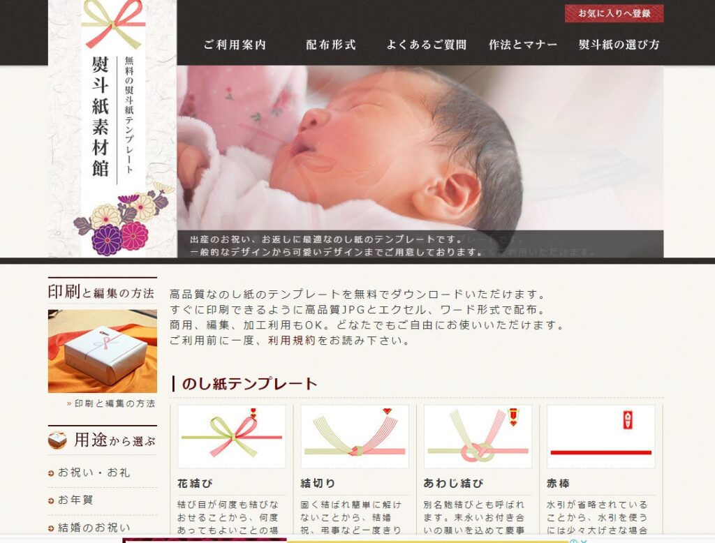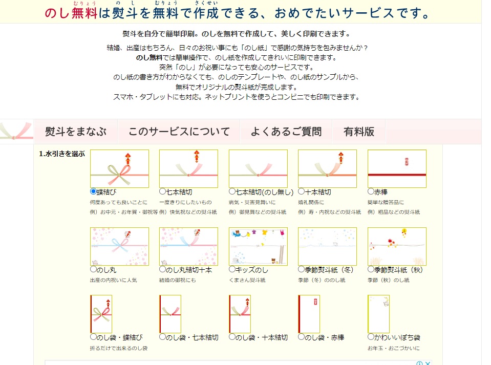 のし無料はその名の通り、無料で様々なのしを作成できるオンラインサービスです。